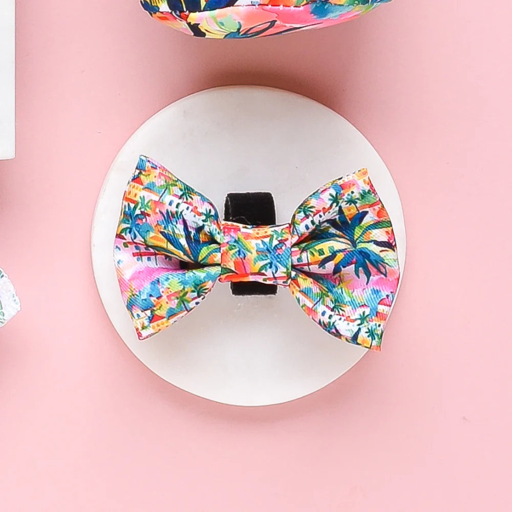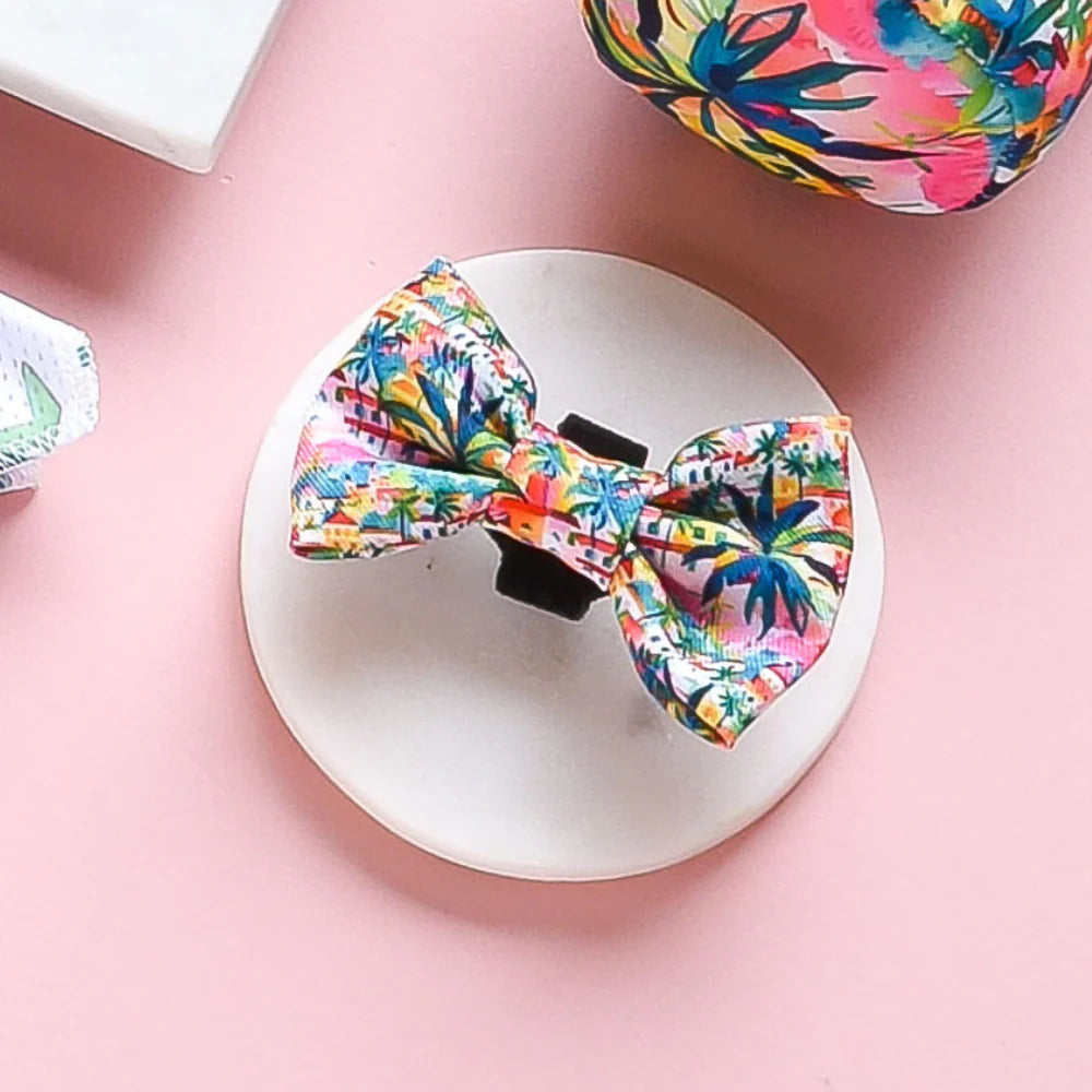 Get your pup ready for some summertime fun with our Portofino Pup Bow Tie! Perfect for dog walks on the beach, this pink bow tie will add a pop of sunshine to your furry friend's wardrobe. Plus, with a playful palm tree design, they'll be the talk of the town (or the dog park).