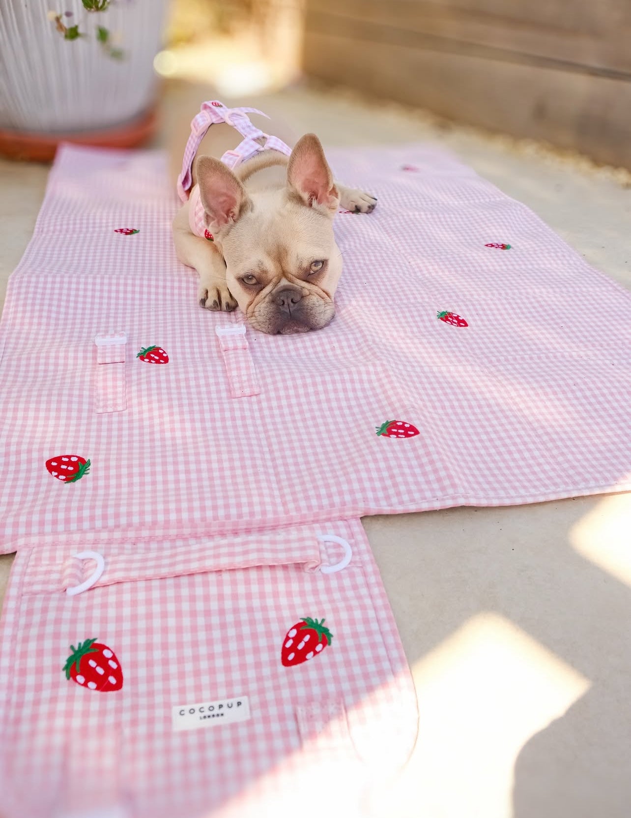 Our Strawberry Picnic Travel Mat is designed to keep your pup comfy, clean, and stylish! It’s pawfect for beach days, island picnics, and even protecting your car – the ultimate travel essential for every pup.